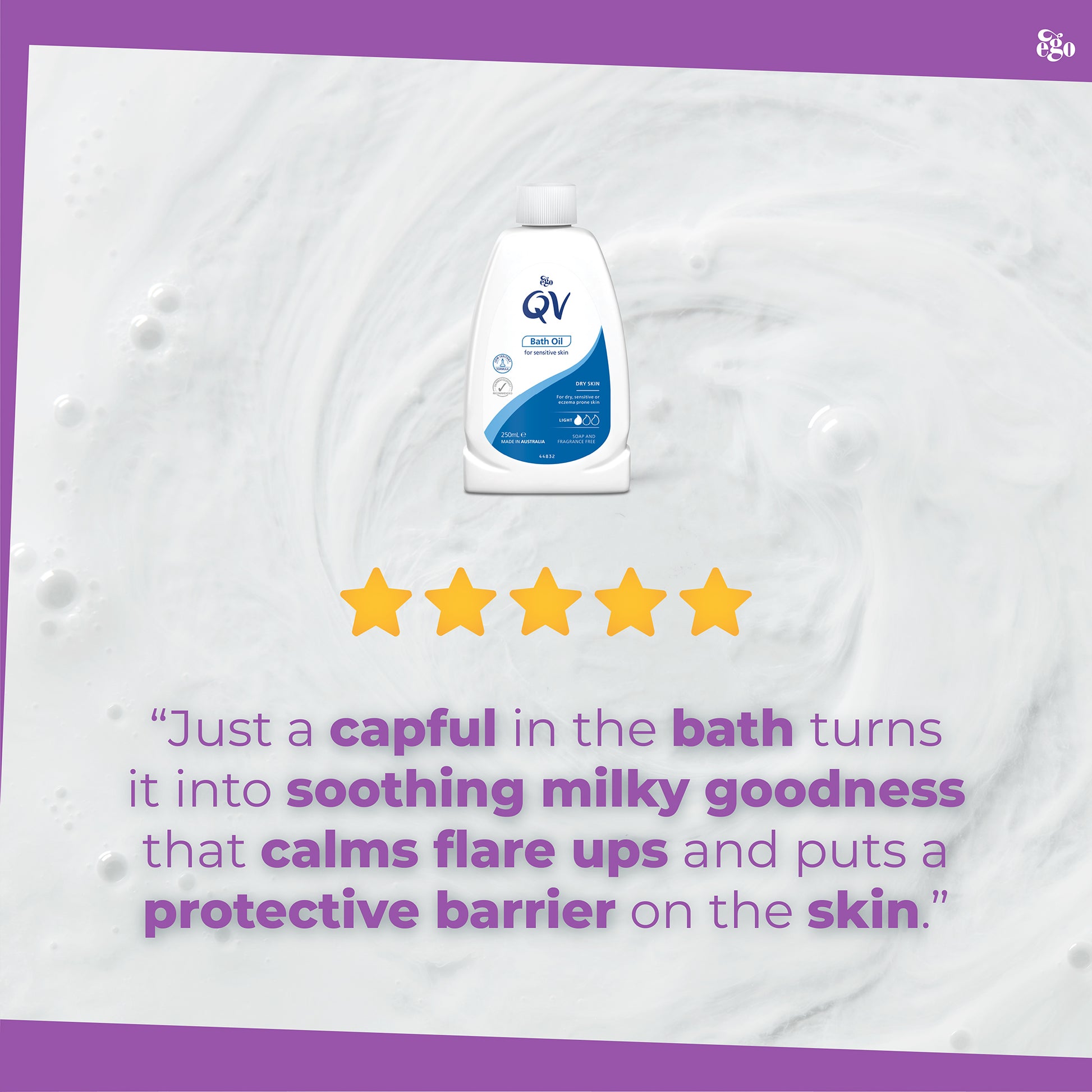 Consumers using large quantities of any paraffin based product, such as QV Bath Oil, should regularly change clothing or bedding impregnated with the product and keep away from naked flames as there is a fire risk. Store below 300C.